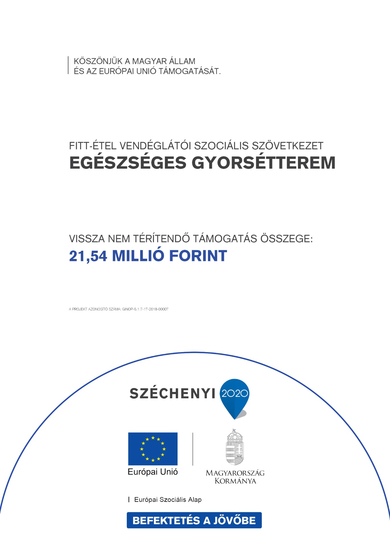 Pályázó neve: Fitt-Étel Vendéglátó Szociális SzövetkezetProjekt címe: "Egészséges gyorsétterem"Szerződés száma: GINOP-5.1.7-17-2018-00007Támogatás összege: 19 278 259 FtProjekt összköltsége: 19 969 448 Ft Támogatás intenzitása: 96,5 %Projekt megvalósításának kezdete: 2019.02.01.Projekt fizikai befejezésének határideje: 2020.06.29.Projekt szakmai tartalma: Kecskeméten egy egészséges gyors éttermet szeretnénk létrehozni, amelyet egybe kötnénk egészségtudatos táplálkozás elsajátításának oktatásával, tanácsadással, másrészt ezáltal új munkahelyeket teremtünk. Munkanélküliségen kívül a tartósan munka nélkül lévő munkavállalókat preferáljuk. Az általunk definiált társadalmi probléma alapján célunk a munkahelyteremtés, a hátrányos helyzetűek, valamint a pályakezdők felkarolása, akik szakmai- és munkatapasztalatra tehetnek szert, biztos megélhetést találva. Célunk a munkavállalók oktatásának támogatása, amellyel javíthatják életminőségüket. Jelen pályázatban definiált probléma egy részének megoldására szeretnénk egy piacképes egészségtudatos éttermet kialakítani és ezen keresztül 3 fő minősített álláskereső foglalkoztatásával választ adni. Tanácsadást is biztosítunk a vendégek részére a reformétkezés bemutatásába és alkalmazásába, ahol a cél az egészségmegőrzés, a minőségi termékek előállítása helyi termelők termékeiből, folyamatos piaci szolgáltatás nyújtás elérése, amely során az értékesítésen realizált profit meghaladja havi átlagban az étterem működésének átlagköltségét. Mérhető célunk 3 új munkahely megteremtése, másodsorban legalább havi szinten 1000-1500 adag egészség tudatos ételt értékesíteni, valamint havi szinten legalább két alkalommal táplálkozási tanácsadást tartani, szakemberek segítségével.